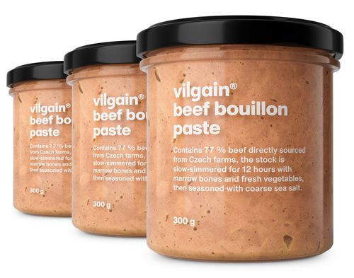 To make one jar of Vilgain Beef Bouillon, we used 232 g of beef from Czech farms – a full 75% of the jar’s content. The rest is made up of vegetables (parsley, carrot, onion, and zucchini) and salt. Nothing else. The consistency is a smooth paste that dissolves well in food and helps you season any dish quickly and easily.