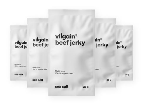 Vilgain Organic beef jerky is made with only two ingredients: quality beef seasoned with sea salt.